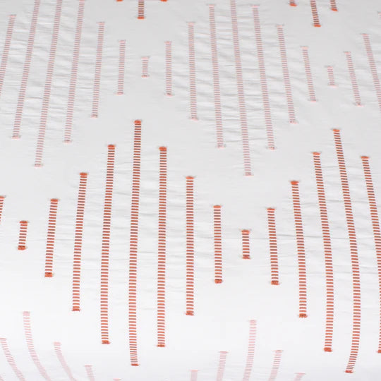The CHRISTIE duvet cover is designed and produced in Portugal, made of high quality percale cotton. The diamond design is embroidered in coral and soft pink on a white background.