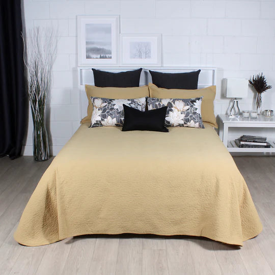 The SABRINA coverlet is woven in Portugal in a high quality cotton. Its leaf pattern in a rich golden yellow gives a warm ambiance to the bedroom. We also offer you the pillow covers in the same fabric.