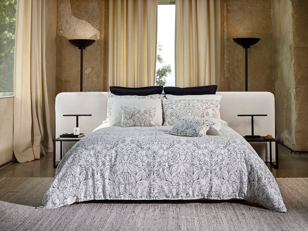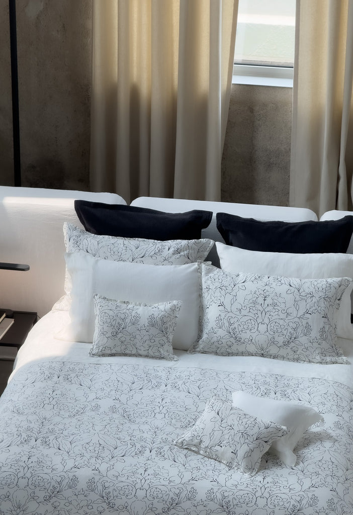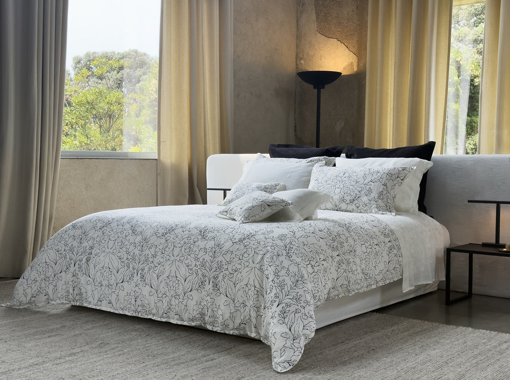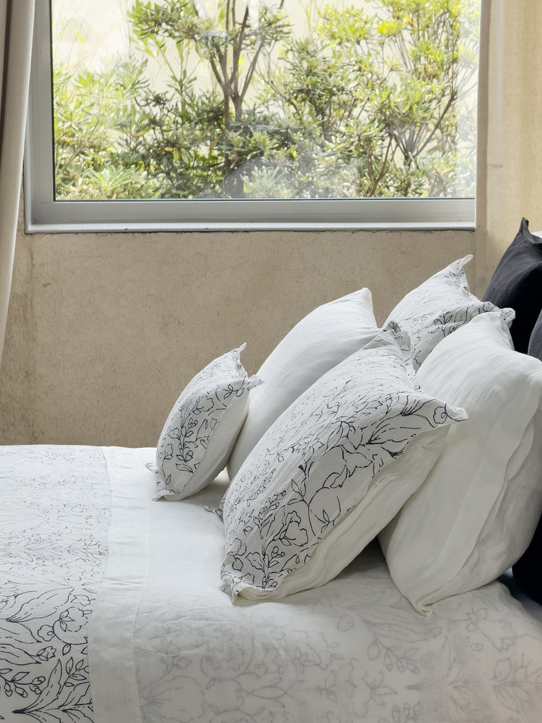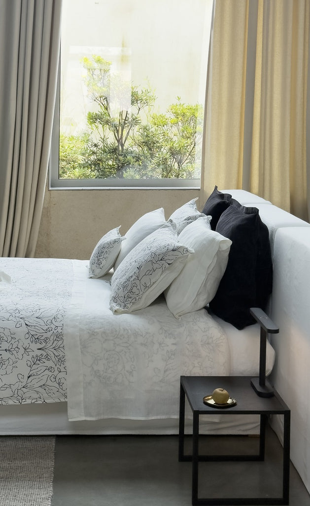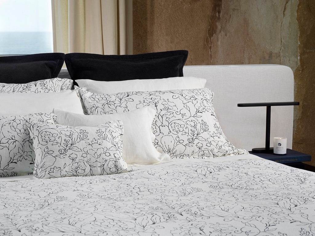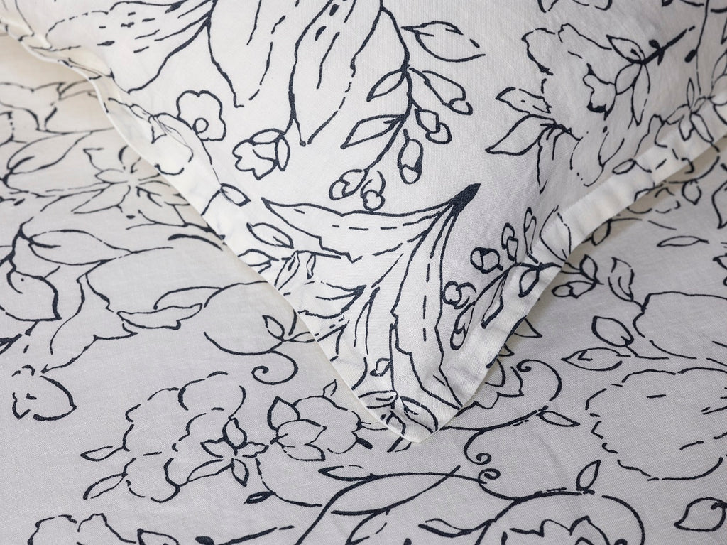 The Amor Perfeito Duvet Cover pays homage to these iconic springtime blooms, with hand-drawn vines and leaves gracefully printed on 100% linen.